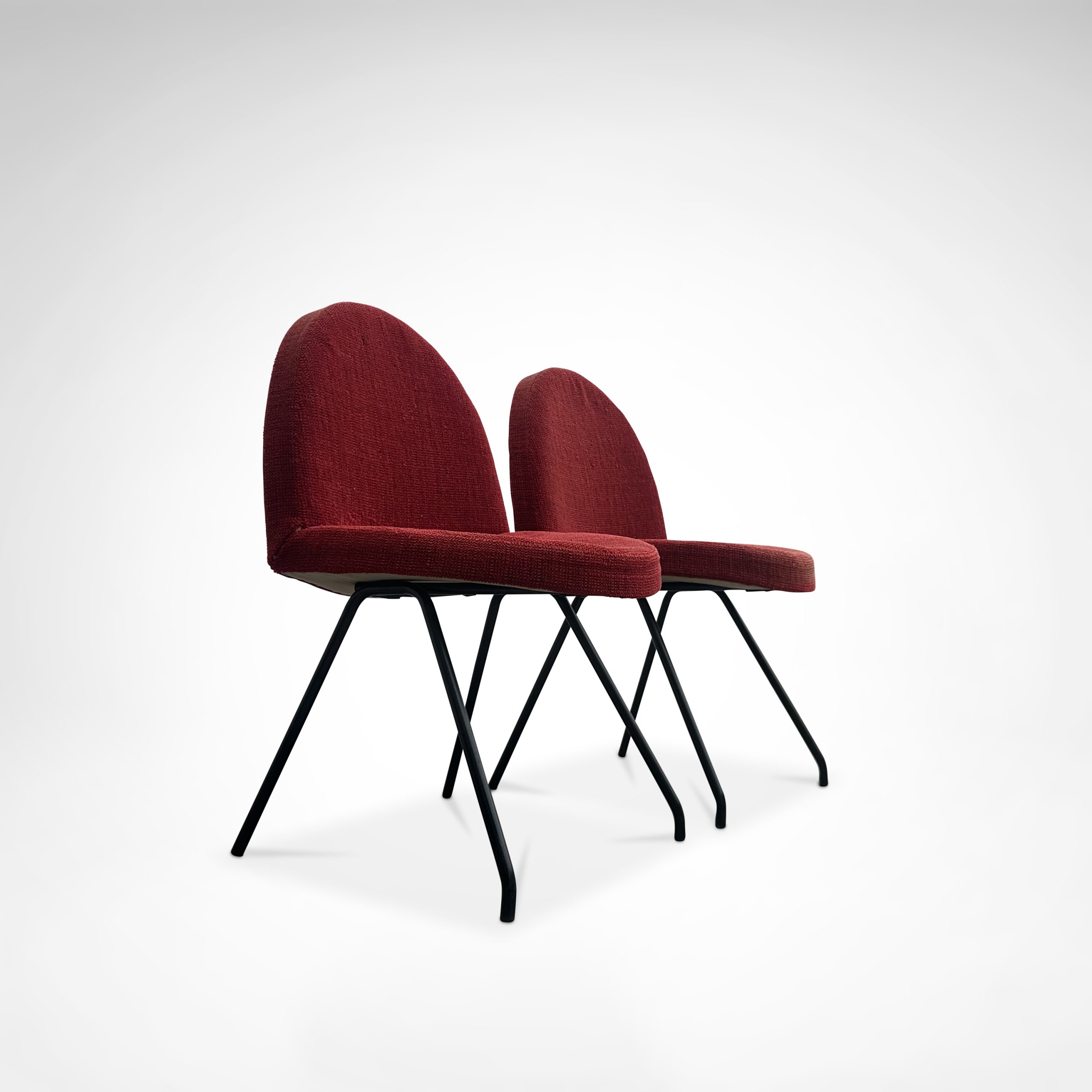 These chairs were designed in 1954 by Joseph André Motte for Steiner France, as part of his series for Steiner. The 771 chairs were actually designed in conjunction with the 770 series. And the similarities are clear, both in the shaped metal frame and the rounded forms of the seat. Notice the twist in the feet near the bottom, a typical Motte design feature. Also the fact that the seat and backrest are of the exact same shape and form.