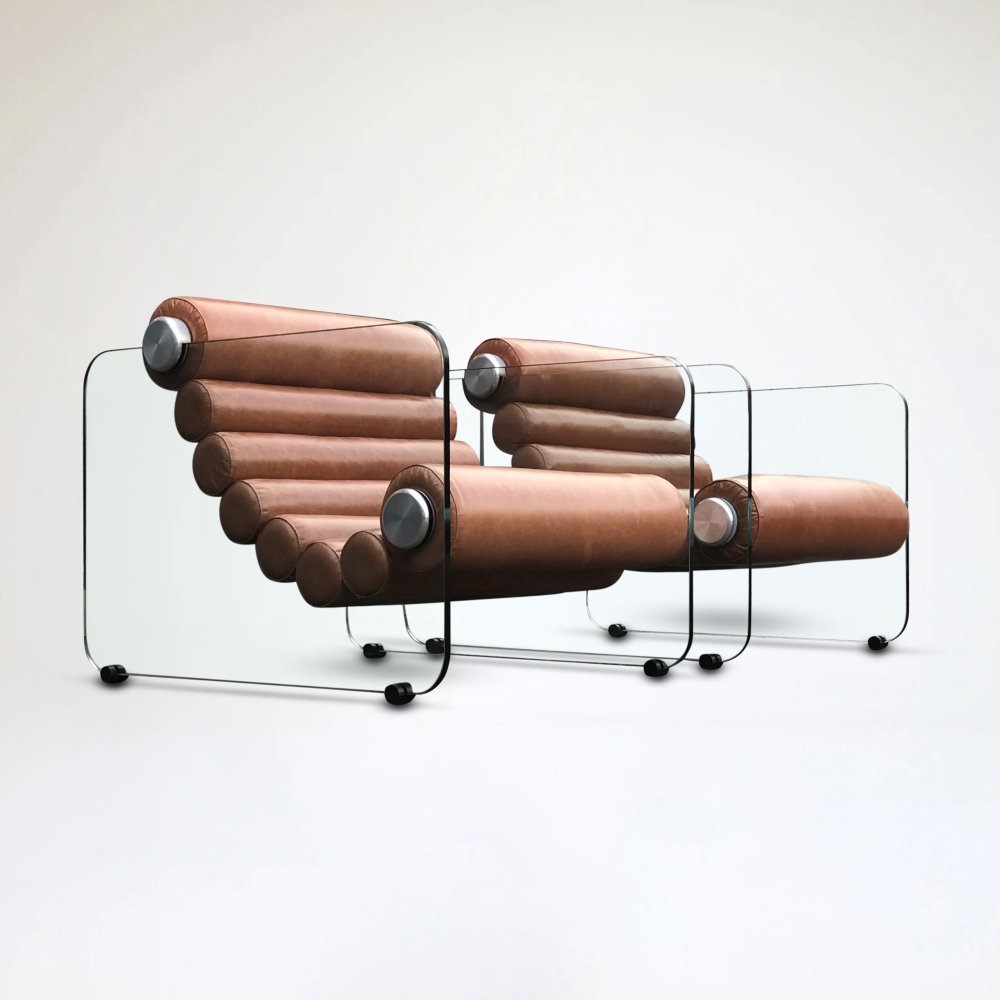 The thick leather rolls are interconnected in a flexible form and are fixed to the glass plates on the front roll, but can be moved along the edge of the glass on the top roll, so that the seating position can be adjusted. The leather rolls are placed in between both glass plates so they seem to float.