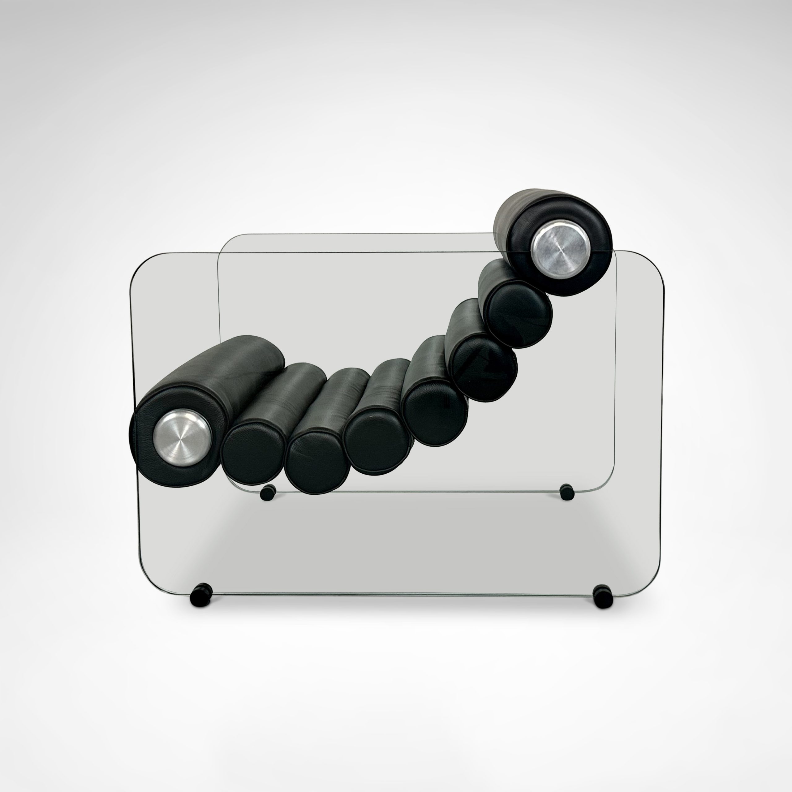 The thick leather rolls are interconnected in a flexible form and are fixed to the glass plates on the front roll, but can be moved along the edge of the glass on the top roll, so that the seating position can be adjusted. The leather rolls are placed in between both glass plates so they seem to float.