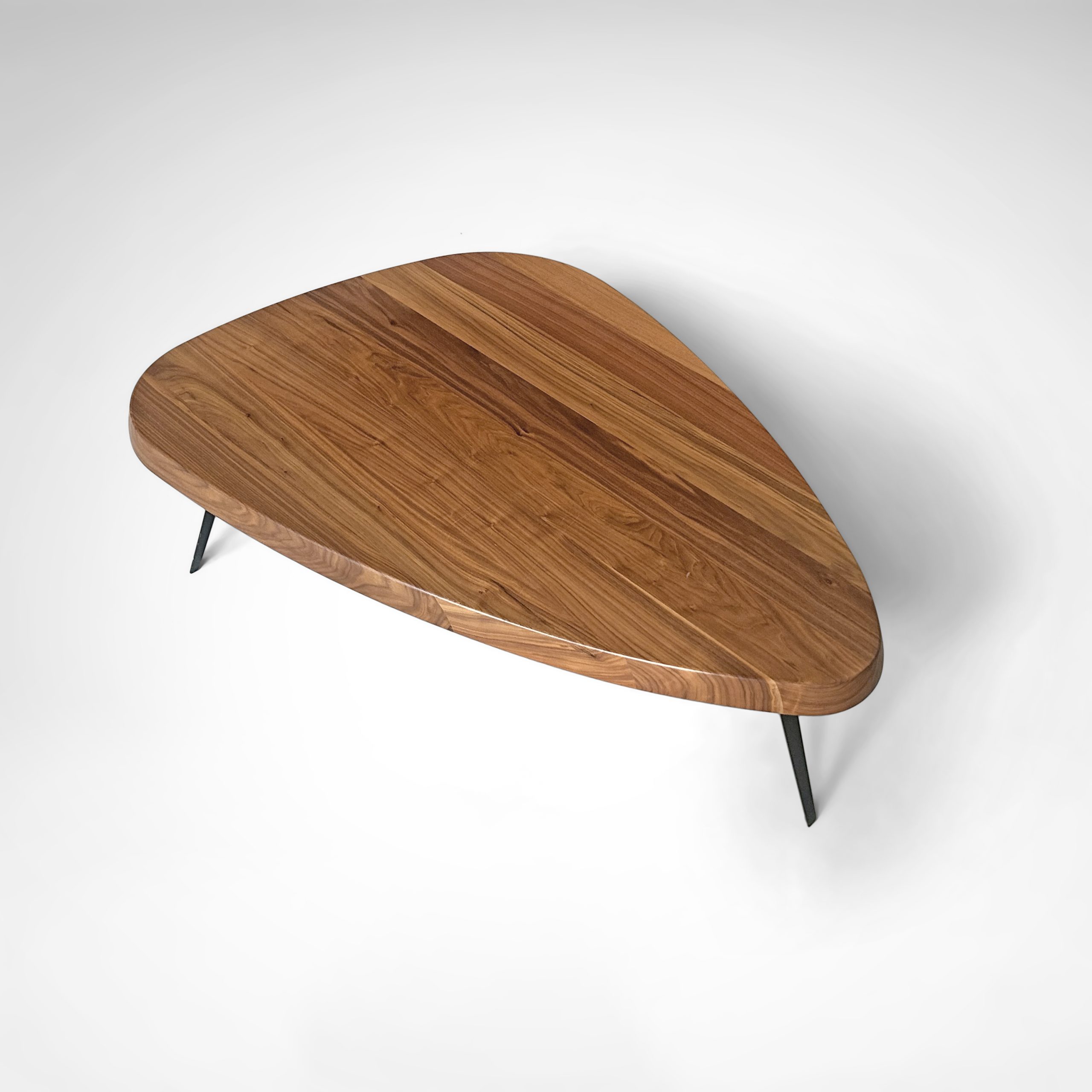 The table design has a characterizing triangle design, with a slightly curved edge, black painted metal feet and consists of one solid walnut slab measuring 2 cm thickness.